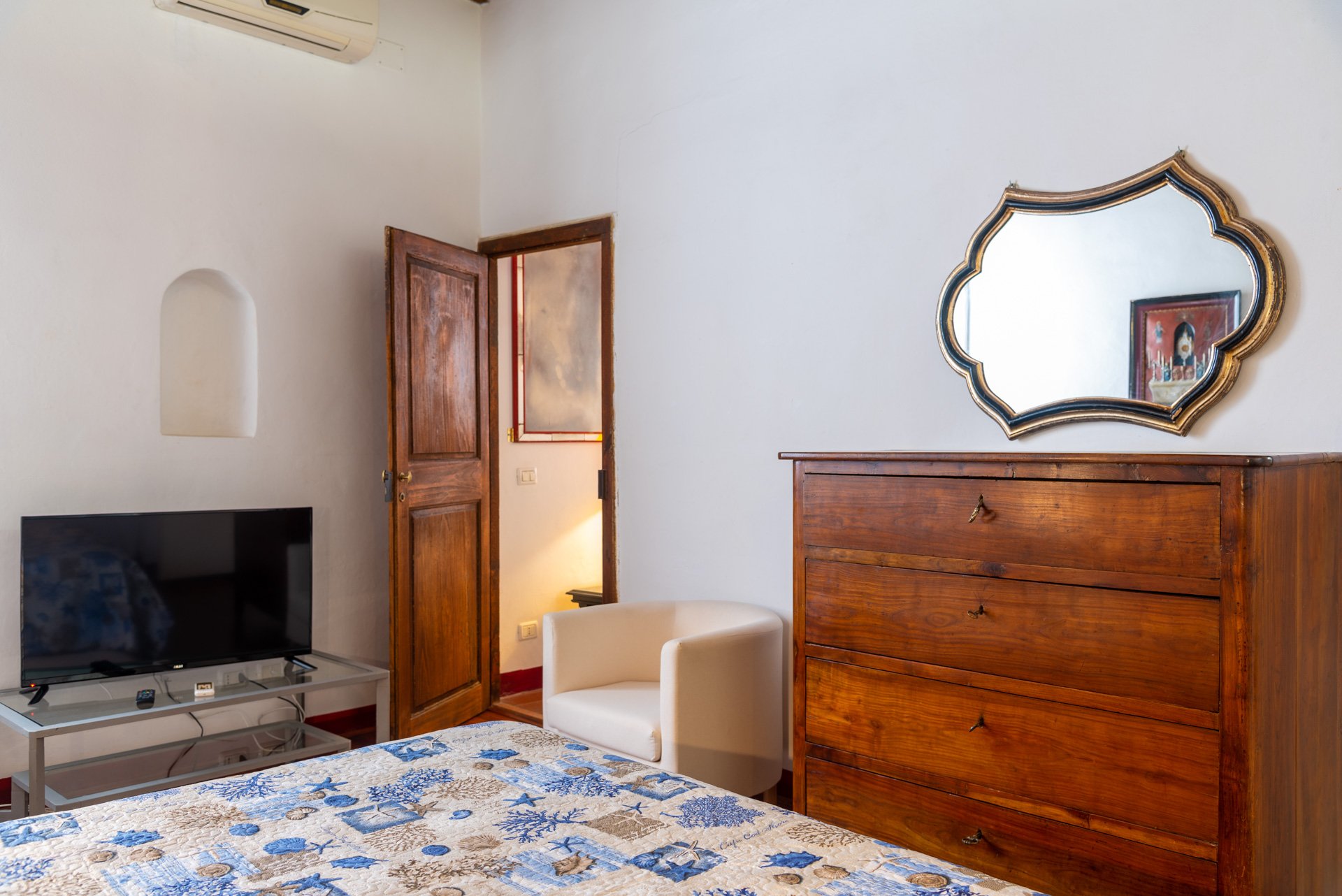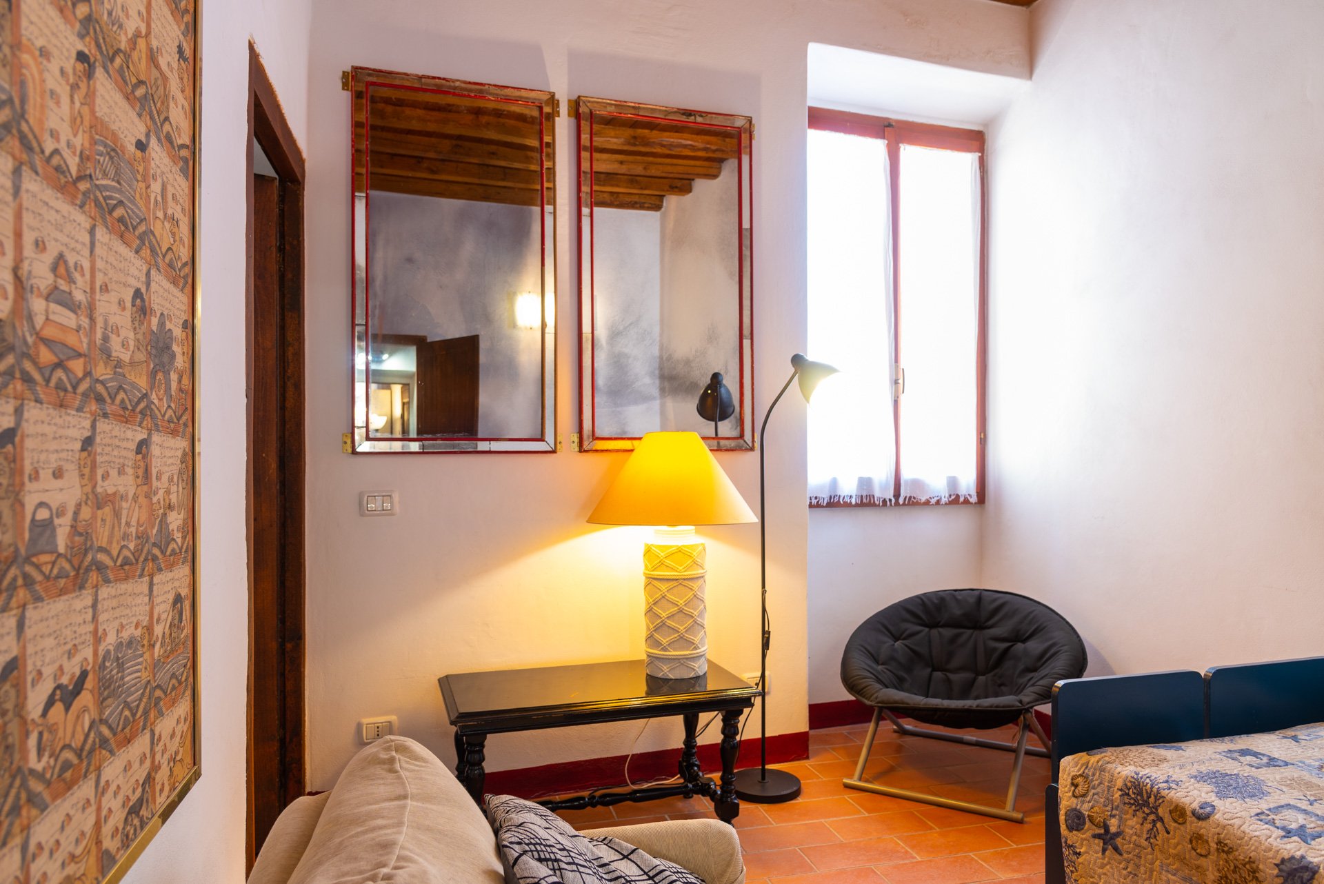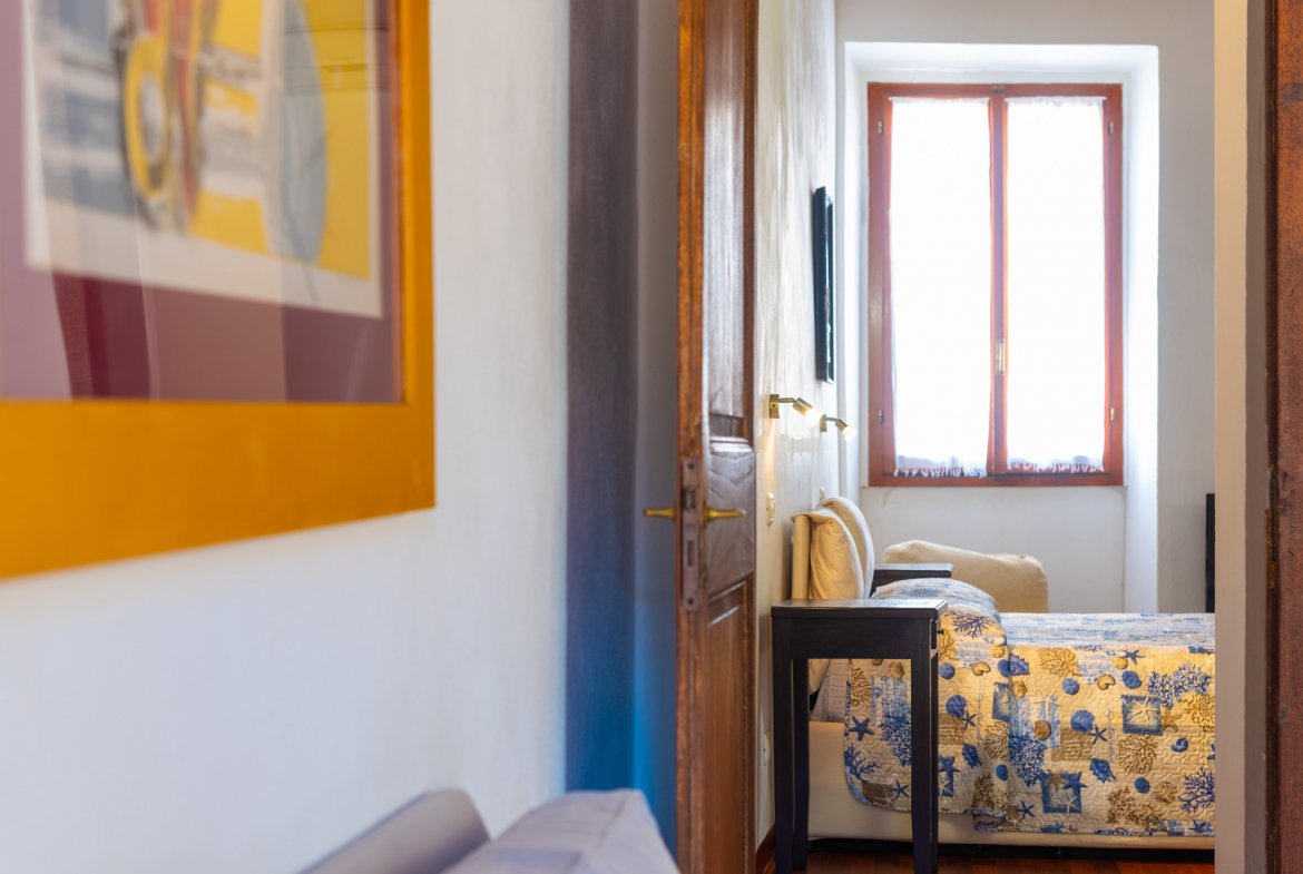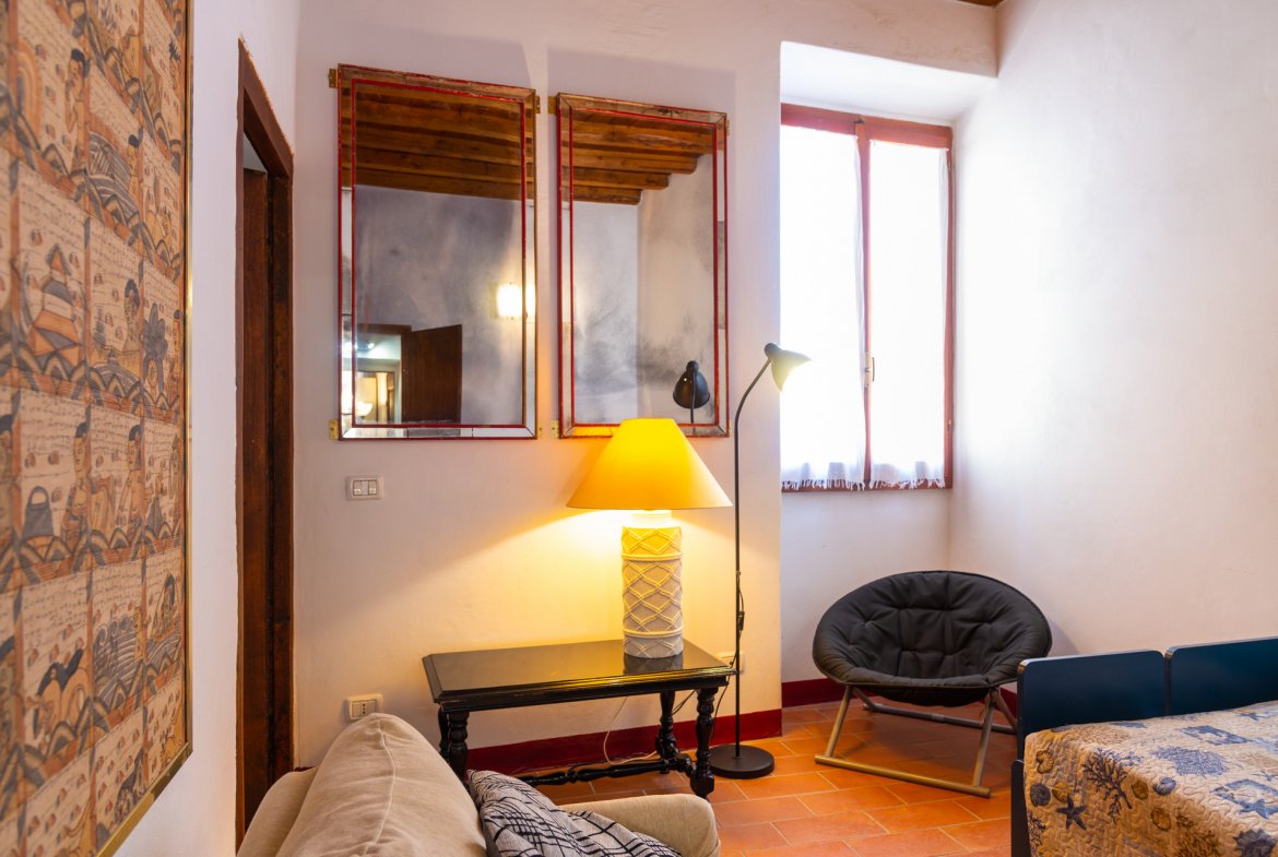 Appartamento 4 pax: al piano secondo del fabbricato con accesso da scala interna a disposizione dei nostri ospiti un bell’ appartamento, di circa 65 metri quadrati. E’ composto da un comodo soggiorno con un divano ad una piazza e mezzo; un piccolo cucinotto (attrezzato con quattro fuochi a gas, frigorifero con piccolo congelatore), da cui si accede ad una terrazza con vista sui suggestivi tetti del centro, completa di tavolo e sedie; una comoda camera matrimoniale con TV; una piccola camera con letto singolo; un bagno con doccia comunicante con la zona giorno. L’ immobile è dotato di aria condizionata nel soggiorno. L’ appartamento non è dotato di posto auto privato, si trova un parcheggio a pagamento nelle vicinanze.