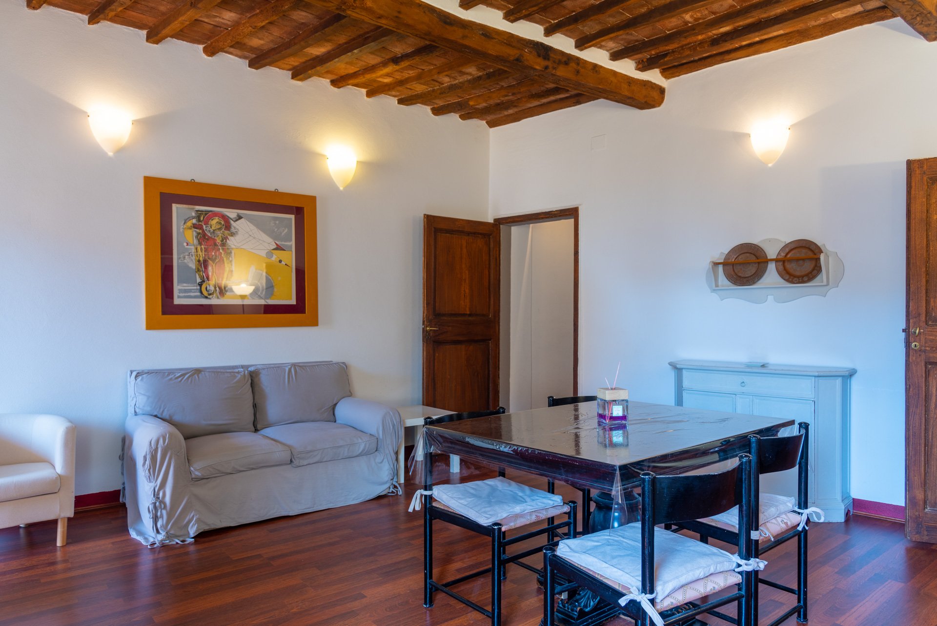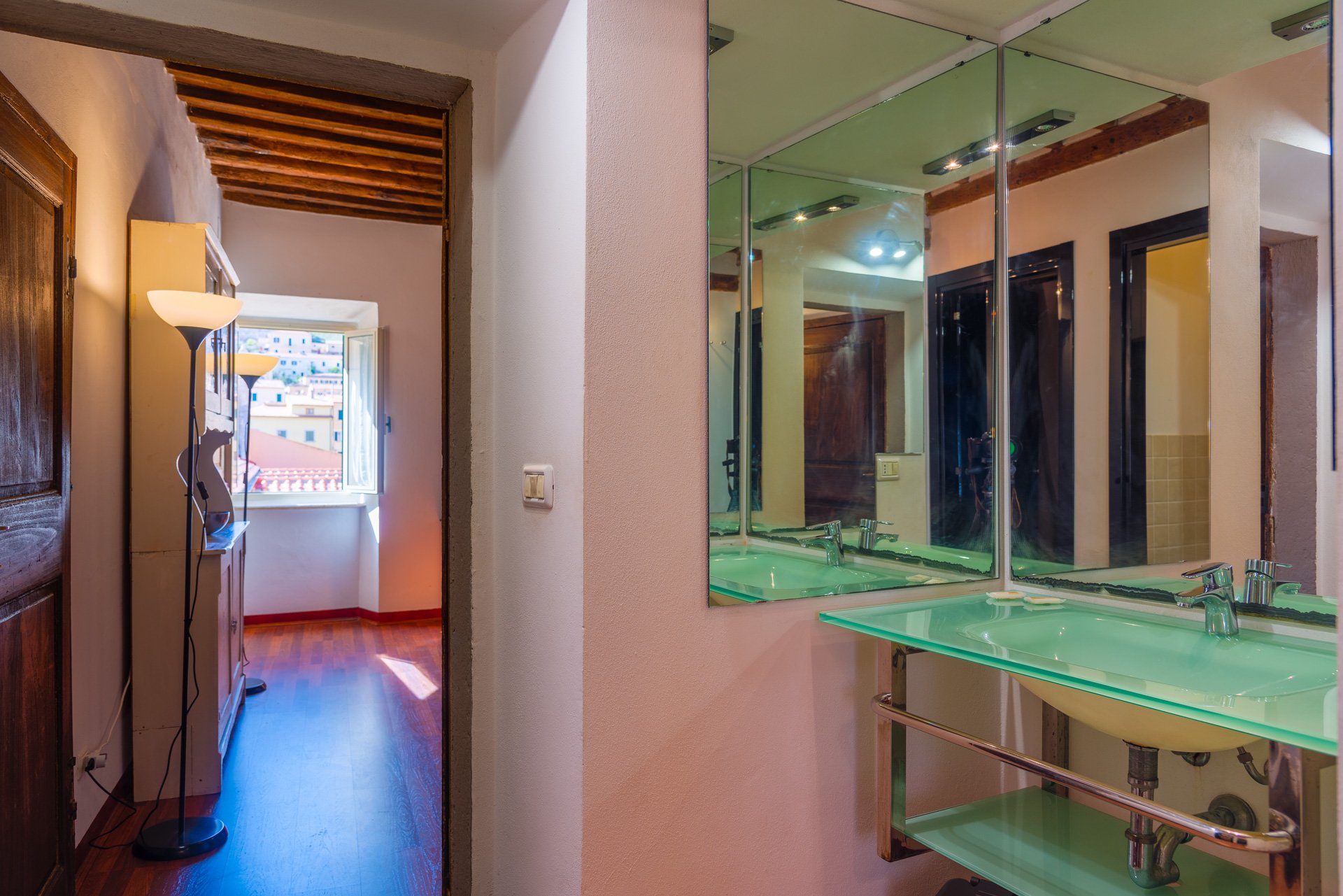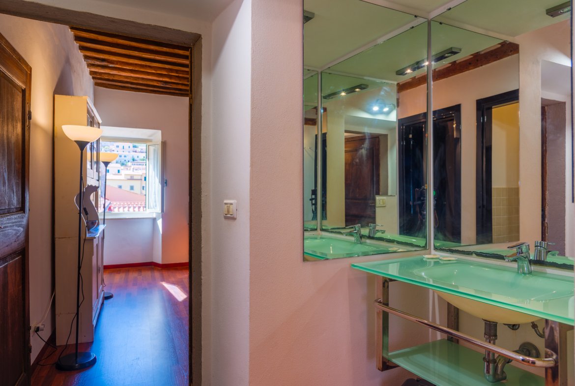 Appartamento 4 pax: al piano secondo del fabbricato con accesso da scala interna a disposizione dei nostri ospiti un bell’ appartamento, di circa 65 metri quadrati. E’ composto da un comodo soggiorno con un divano ad una piazza e mezzo; un piccolo cucinotto (attrezzato con quattro fuochi a gas, frigorifero con piccolo congelatore), da cui si accede ad una terrazza con vista sui suggestivi tetti del centro, completa di tavolo e sedie; una comoda camera matrimoniale con TV; una piccola camera con letto singolo; un bagno con doccia comunicante con la zona giorno. L’ immobile è dotato di aria condizionata nel soggiorno. L’ appartamento non è dotato di posto auto privato, si trova un parcheggio a pagamento nelle vicinanze.