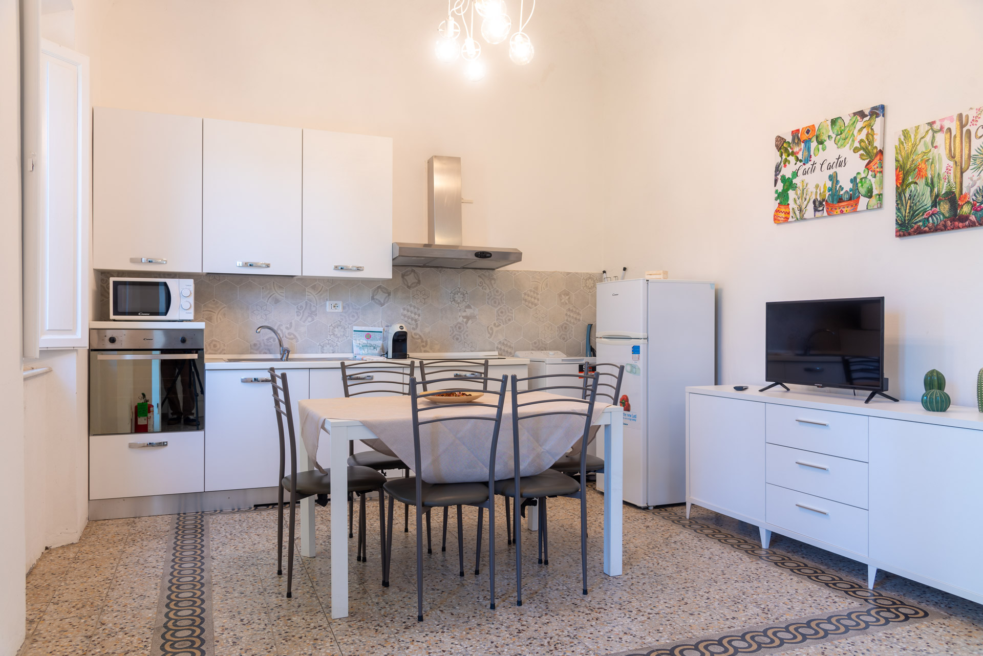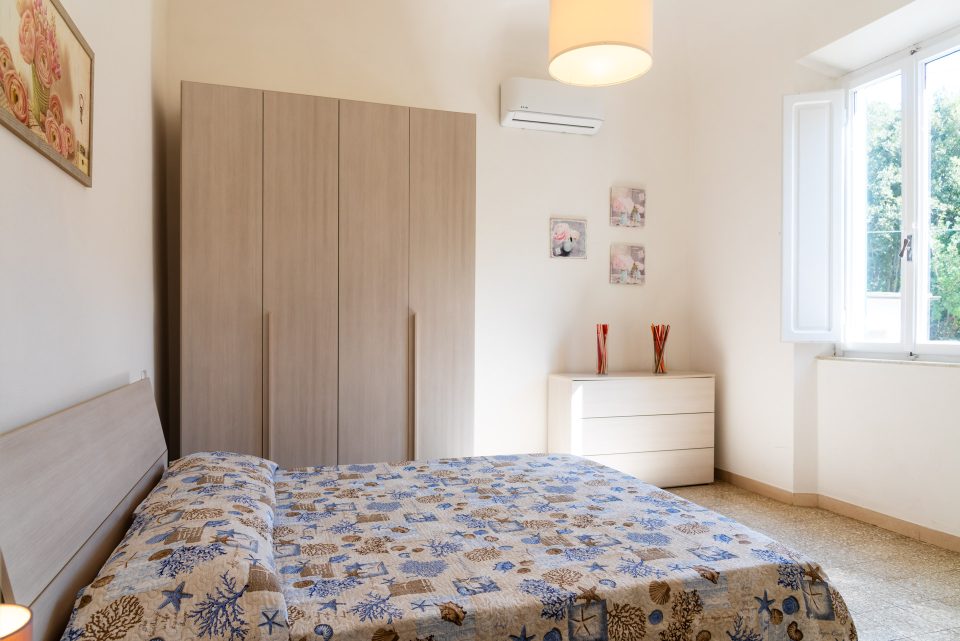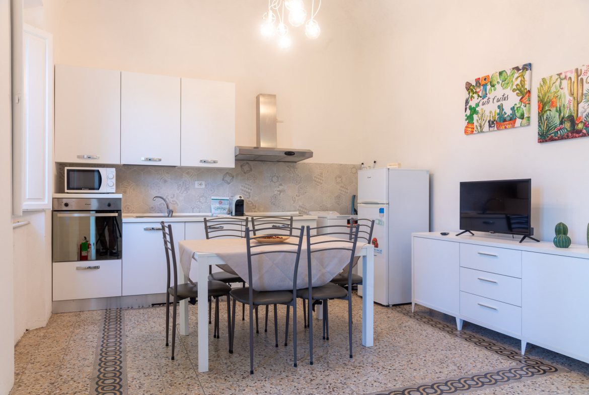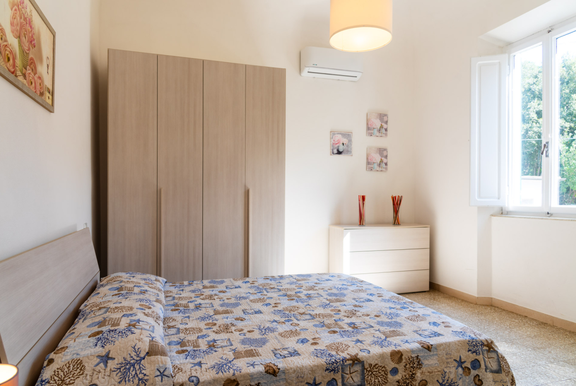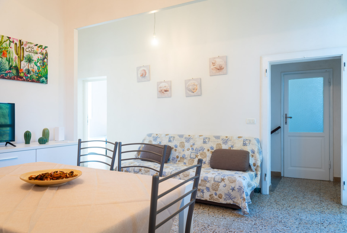 Trilocale 4/5 pax: l’immobile di circa 50 metri quadrati è ubicato al piano primo, al quale si accede tramite una scala interna indipendente, è composto da un ampio soggiorno con un terrazzino con tavolo e due sedie, un angolo cottura completo di quattro fuochi ad induzione, forno elettrico, frigorifero con congelatore, microonde, bollitore, frullatore ad immersione, un disimpegno, una camera con letto matrimoniale, una camera con due letti singoli ed una piccola camerina con un letto singolo, bagno con doccia. La struttura è dotata di aria condizionata, riscaldamento e wi-fi. Arredamento nuovo, moderno e funzionale. Posto auto scoperto all’interno della proprietà.
